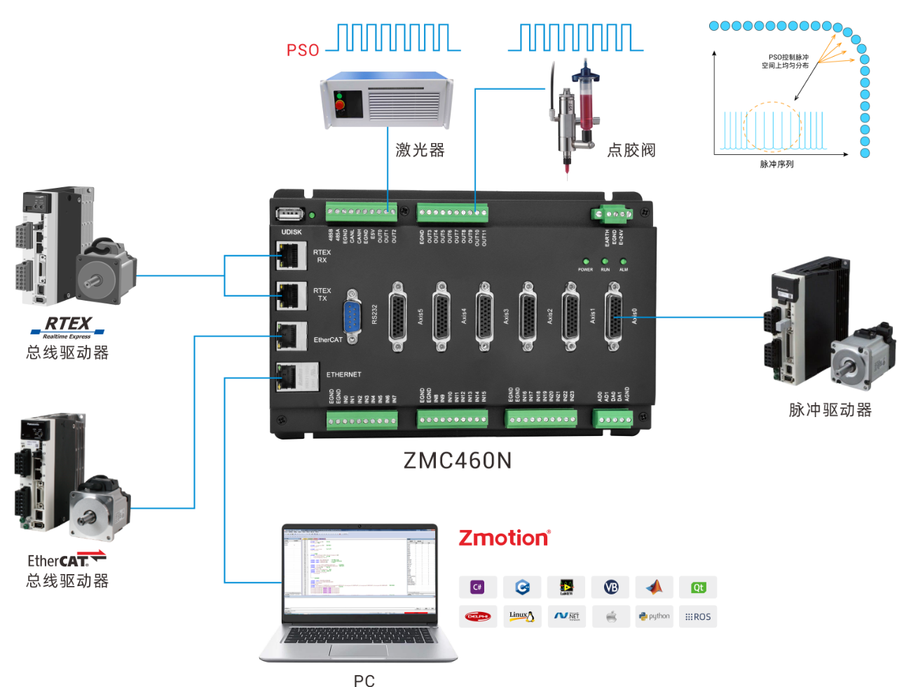 硬件选型的首要要求是支持PSO功能,再分析PSO的应用场合和轴数等选择具体的型号。本例以ZMC460N双总线运动控制器为例展开介绍。