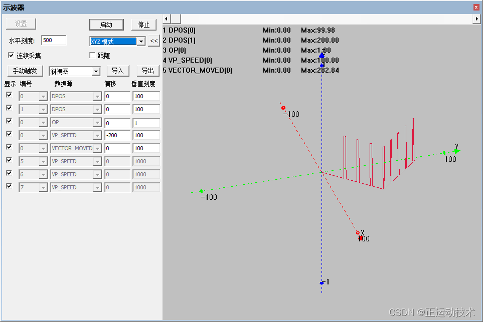 例如轴0回零后先正向运动200,在反向运动100,此时的绝对坐标为100,但矢量坐标为300,若执行两轴插补运动,则矢量坐标为当前插补运动的合成轨迹的矢量,故矢量比较的模式,支持多轴的场合。