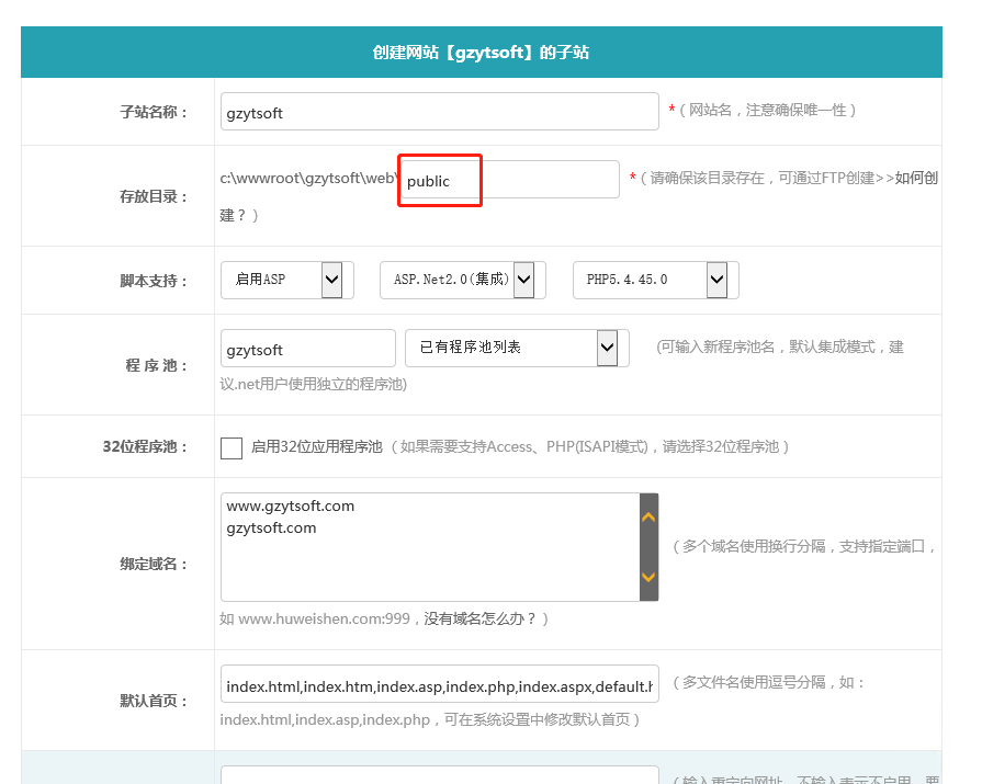 二、 在网站里建一个子站,自站的目录是public,域名填写你真实的域名