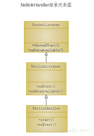 start()方法中创建了一个句柄值为mSock的套接字,用来和kernel通信;而实际具体的socket信息交互是由NetlinkHandler处理的。 NetlinkHandler的实现有一套继承机制,其实际继承关系如图所示: