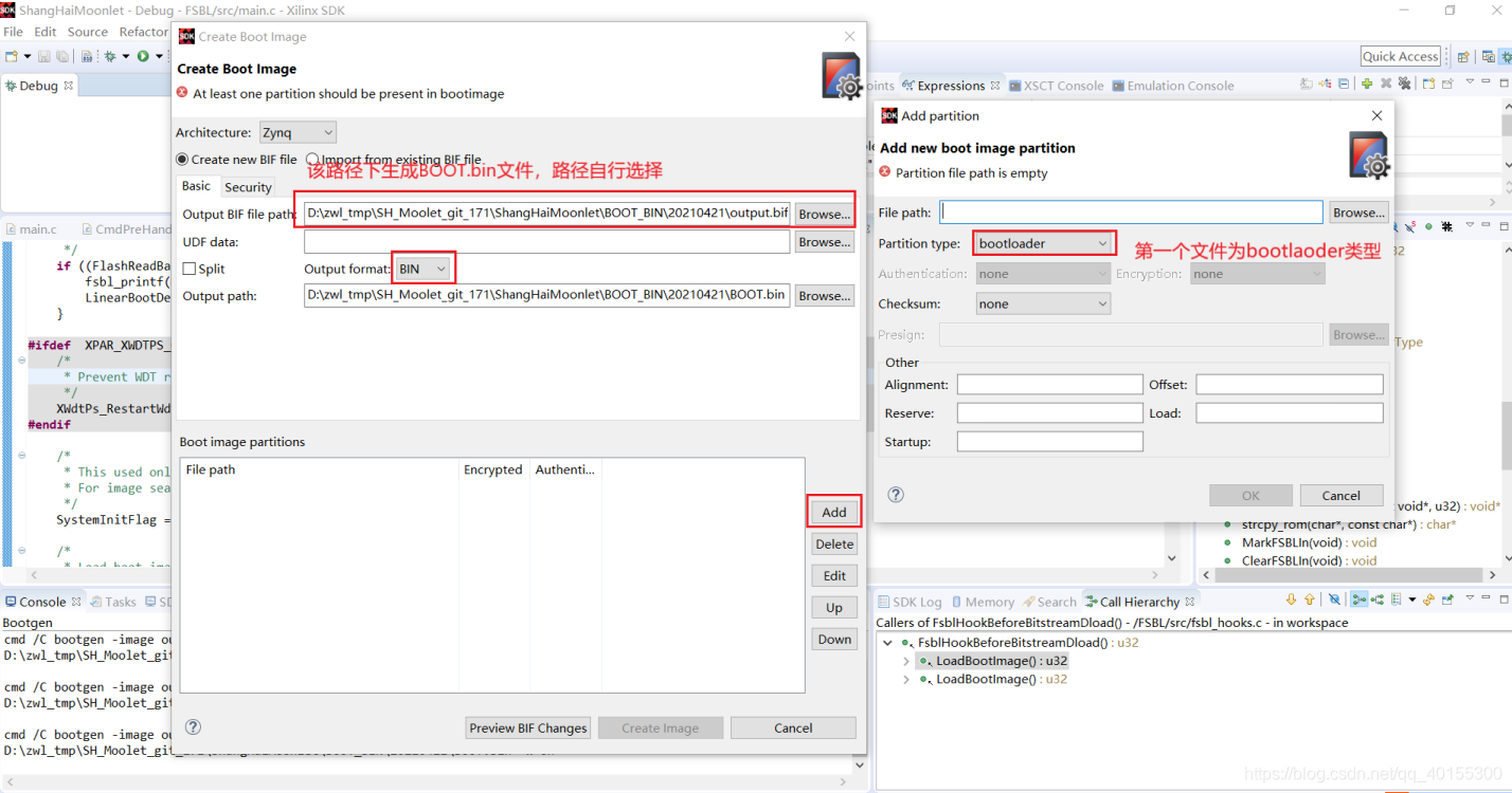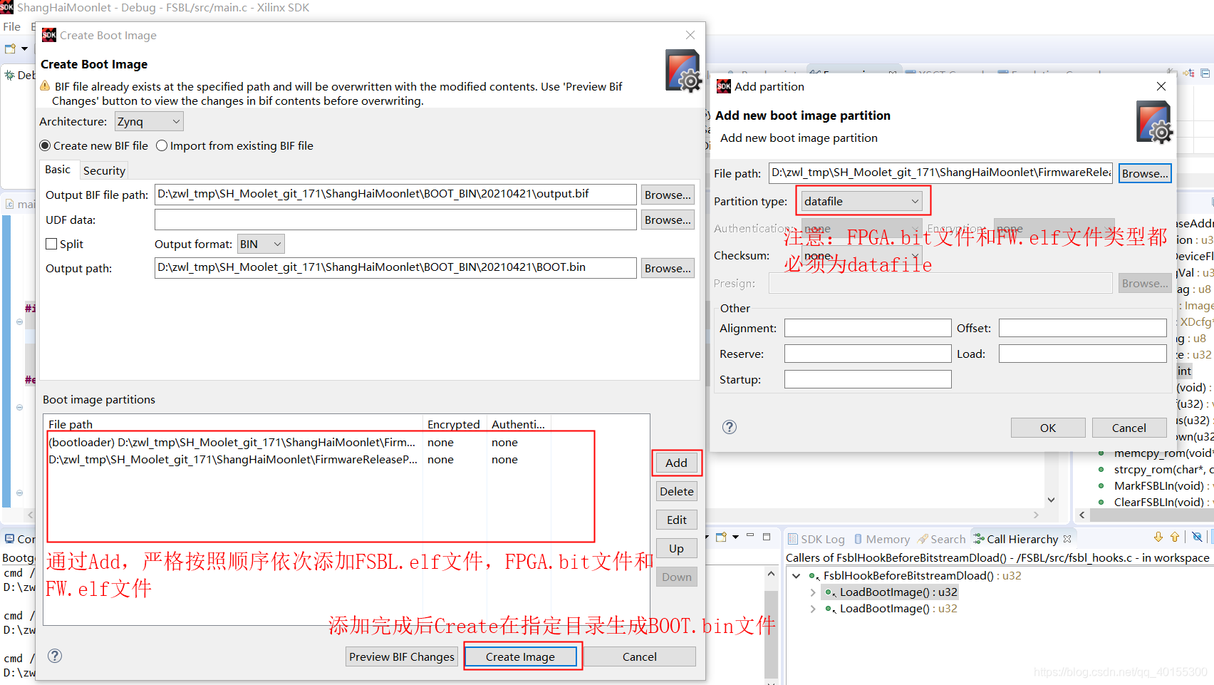 (1)在SDK开发环境下,将FSBL.elf文件,FPGA.bit文件和FW.elf文件按次序添加并打包成BOOT.bin文件