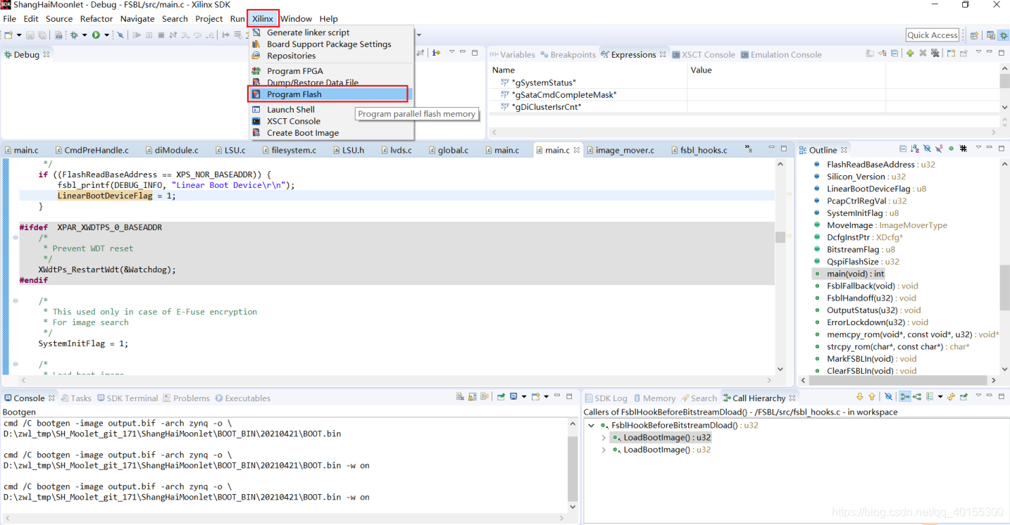 (1)在xilinx SDK环境中通过JTAG进行固化,首先通过选项Xilinx->Program Flash进入到烧写界面