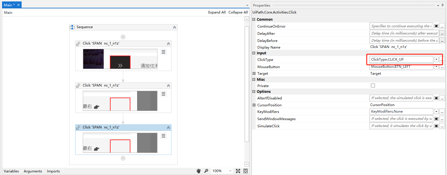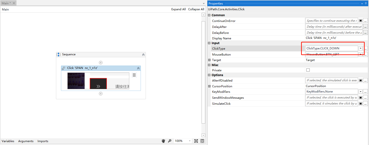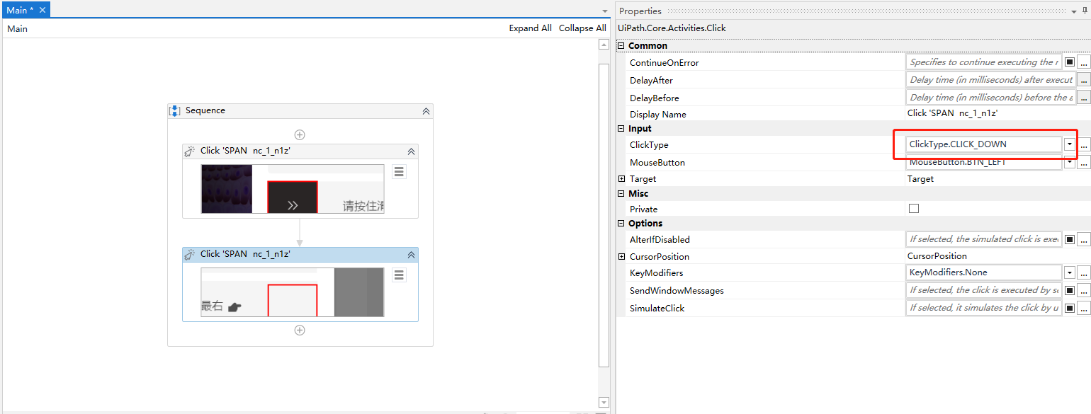 1.首先使用"Click"在网页中标选出滑块元素,并将"Click Type"属性设置为"Click Down",此时这个可以作为滑动模块的初始位置