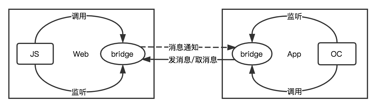 正如 bridge 这个名字一样,它起着桥梁作用,实现了两端的数据交互。这两个 bridge 基本实现了相同的功能,唯一的区别在于 Web 端这边的 bridge 没法直接发送消息内容,只能告诉 App 端有消息。