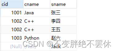 -- 左(外)连接的结果包括LEFT JOIN子句中指定的左表的所有记录,以及所有满足连接条件的记录。如果左表的某条记录在右表中不存在则在右表中显示为空。
