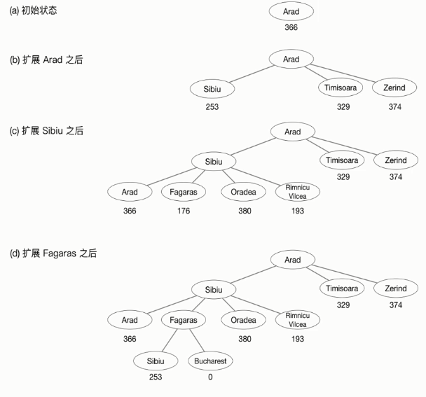 过程:从起始状态(start state)Arad根据辅助信息寻找下一个可能成为最短路径的城市,也就是寻找与Arad相邻的城市中与Buchareat的直线距离最短的那个城市作为下一个状态(state),也就是Sibiu,依次往下寻找,最后找到最短路径: