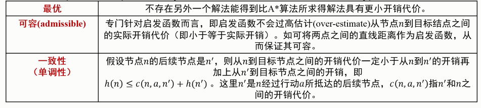 为了保证A*算法是最优(optimal),需要启发函数 h(n) 是可容的(admissible heuristic)和一致的(consistency,或者也称单调性,即 monotonicity)