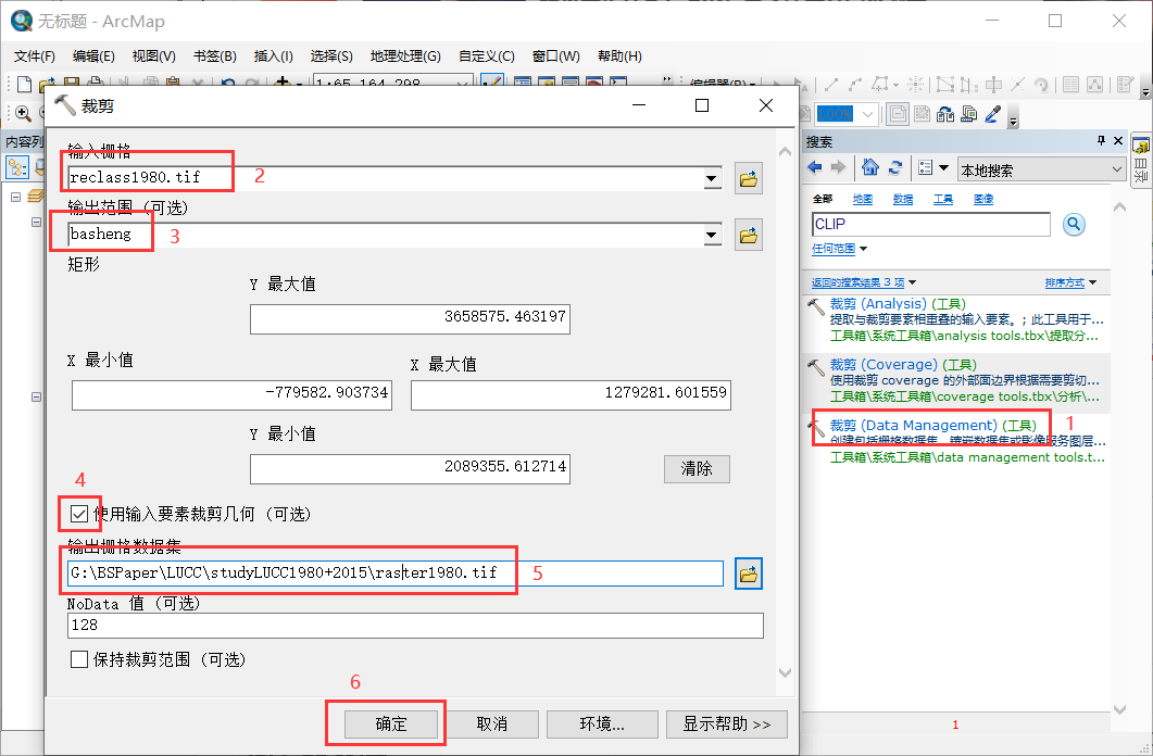 3.上一步完成后土地利用分类就完成了,然后裁剪出自己的研究区,如果是对整个中国研究的话就不用裁剪了,裁剪步骤如下: