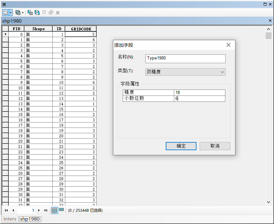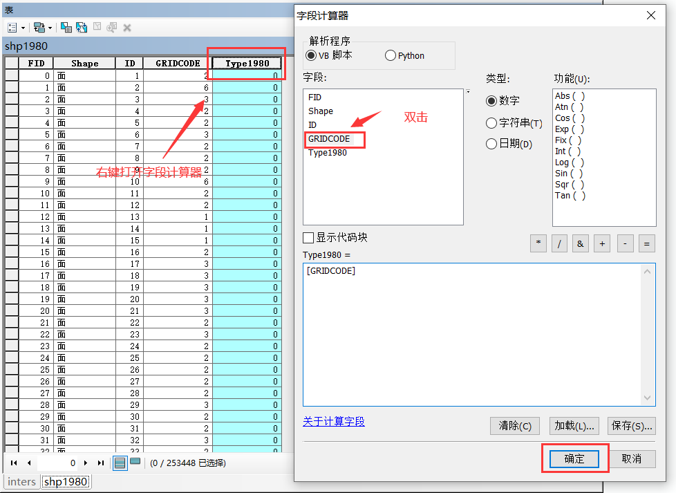 5.得到转化后的矢量面状数据后,在其属性表中加上一人字段Type1980,将值设置的与GRIDCODE一样,操作如下: