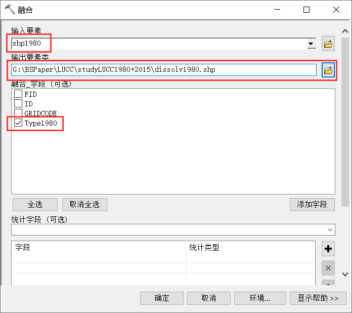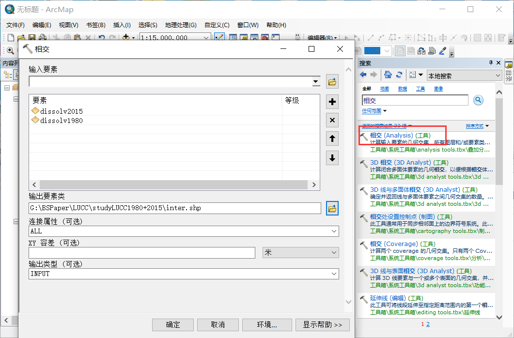 7.上一步完成后就得到了1980年的融合矢量数据 dissolv1980.shp ,用上面的1-6步骤对2015年的土地利用数据处理,得到矢量数据dissolv2015.shp,然后对这两年的这两个数据进行相交处理,操作步骤如下: