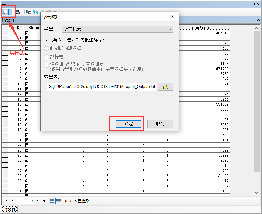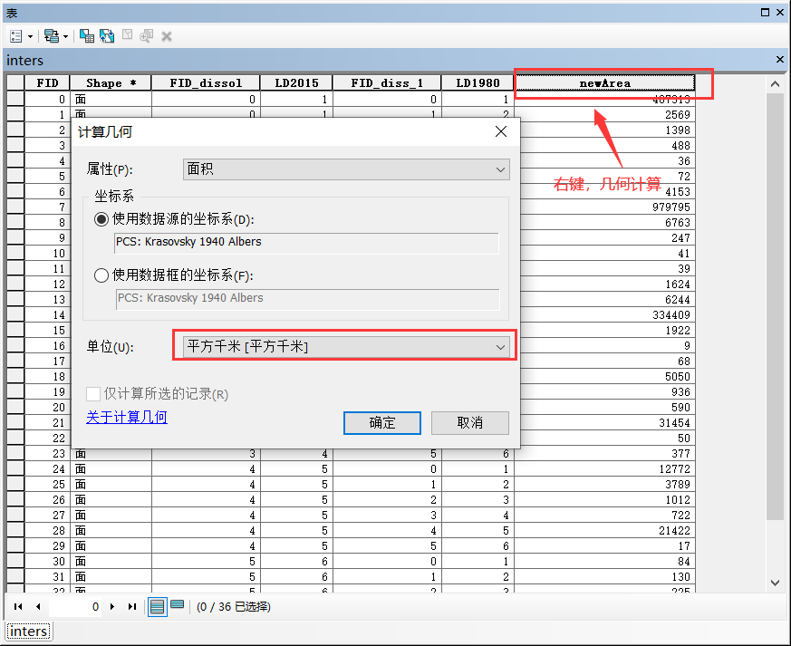 8.打开相交矢量数据属性表,添加一个字段newArea,用来计算土地类型面积,操作步骤如下: