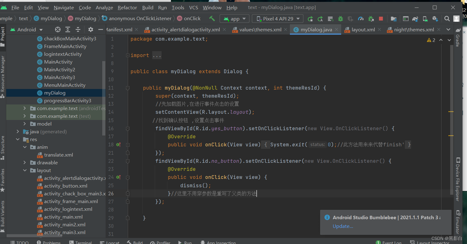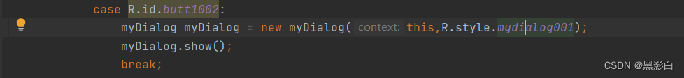 第三步:设置一个java类 并继承Dialog类 ,选择第二个构造方法 ,并设置点击事件