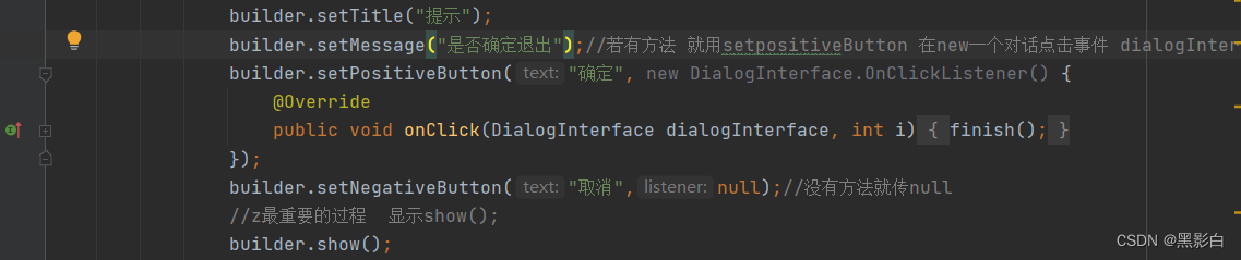 第二步是设置对话框的提示内容 ,有4个主要方法 (窗贴提示内容:setTitle() / setMessage() )(点击事件代码 : setPositiveButton() 与 setNegativeButton() 其中第一个是确定功能 ,在第二个参数位置new new DialogInterface.OnClickListener()的点击事件 ,来设置点击后应出现的功能 . 第二个是取消功能,在第二个参数传入null )