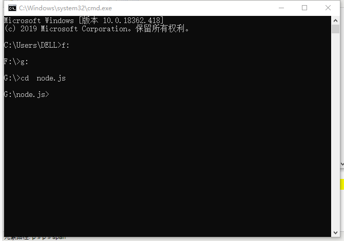 2.要是想要切换到具体的文件夹,需要用cd 后跟你想要的查找的文件夹的名字,比如说查看G盘中node.js这个文件夹
