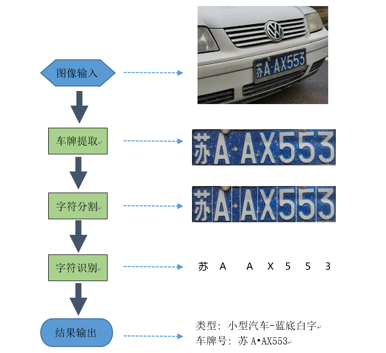 一般来说,一个完整的车牌识别系统的处理流程包括图像输入、车牌提取、字符分割、字符识别和结果输出这五部分。其中车牌提取、字符分割和字符识别是较重要的部分,而车牌提取尤为关键,采用哪种算法或算法组合决定了整个系统的性能。