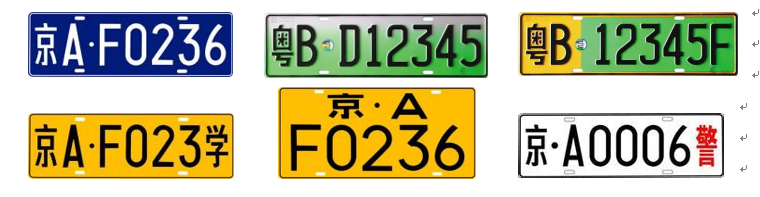 关于中国的车辆号牌种类的简明介绍,可参考百度百科:https://baike.baidu.com/item/%E8%BD%A6%E7%89%8C/8347320?fr=aladdin。更详细、更专业的资料请参照公安部发布的GA36-2018标准文件。