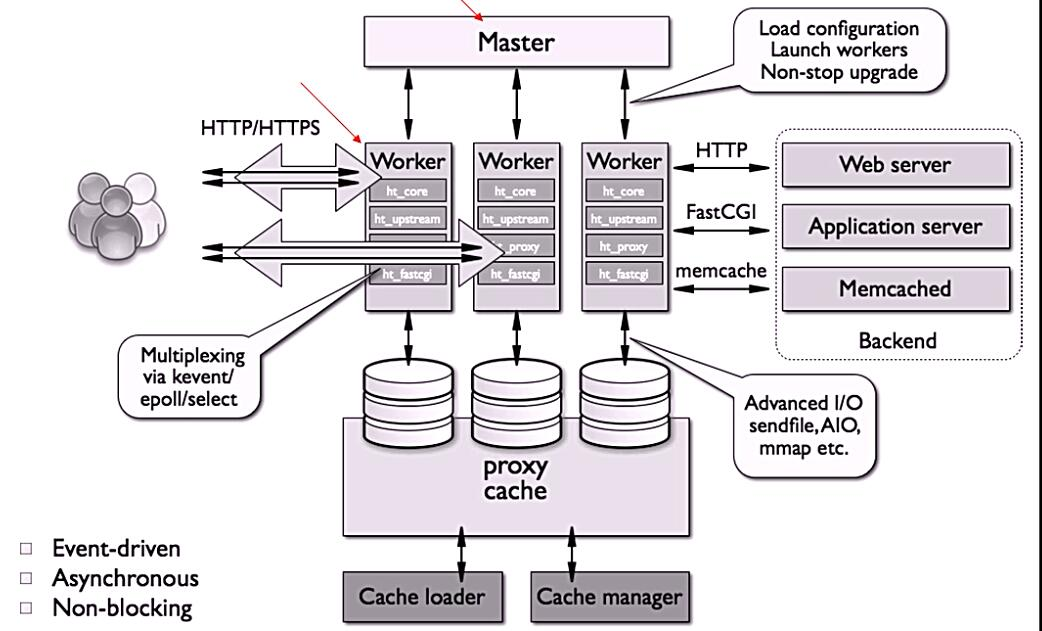 图解:首先用户通过http/https协议访问nginx的主机,这时nginx会启动一个master进程,这个进程,不处理客户端的请求,而是生成worker线程(这里是一个负载均衡集群),通过worker线程来处理客户端的请求,若用户请求网站服务,worker就会到web server这个服务集群提取对应的资源给客户端,同理,这个Application server可以用来访问应用服务器,Memcached缓存服务器,backup是后端的意思。