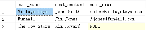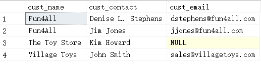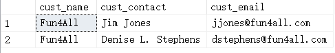 这条查询把cust_name等于fun4all的数据行都检索出来,使用操作符 = 来做相等测试。你会发现有个输出了两次,因为它满足两个select的检索条件。