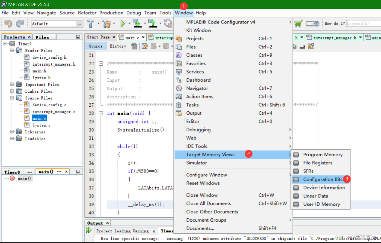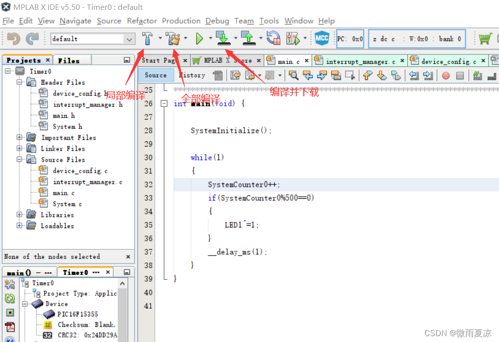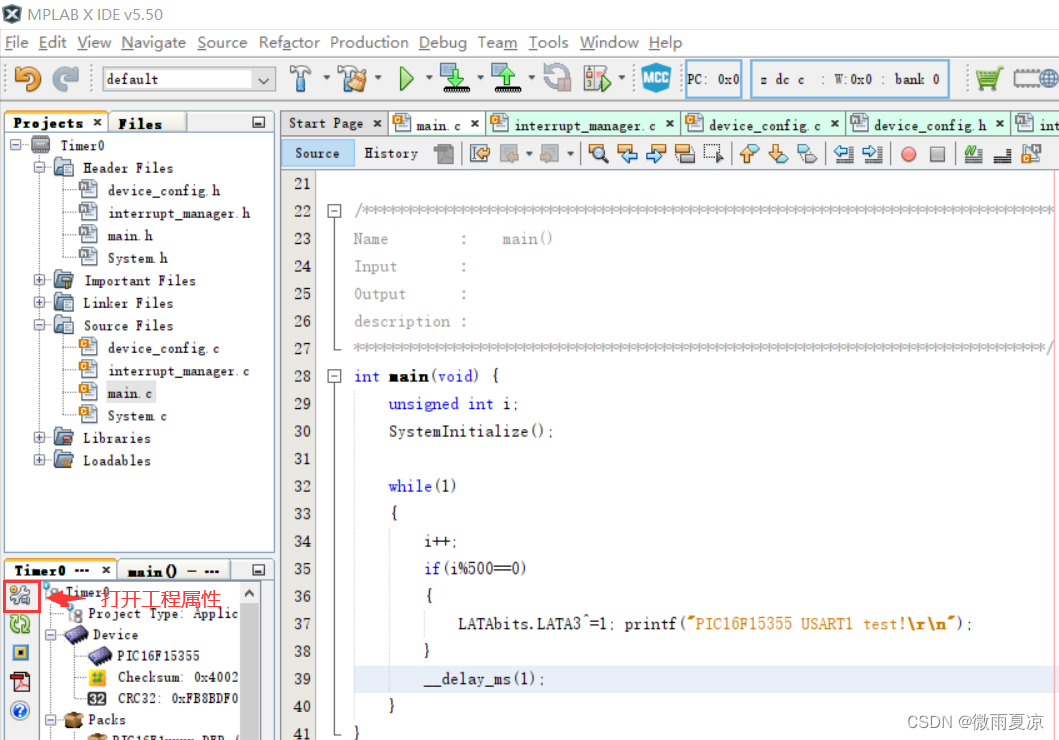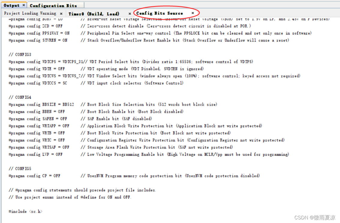 Config Bits Source 里的全部代码,复制到.c文件中,配置位自动生成代码时,也会把 xc.h文件包含进来,如下