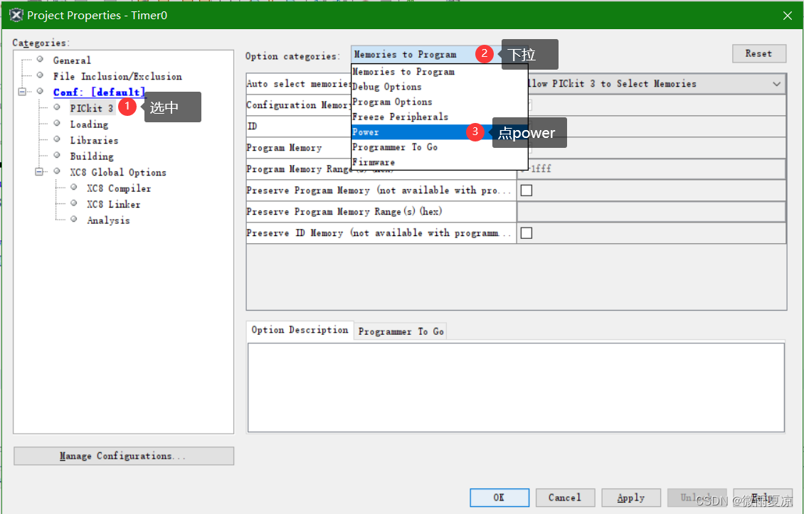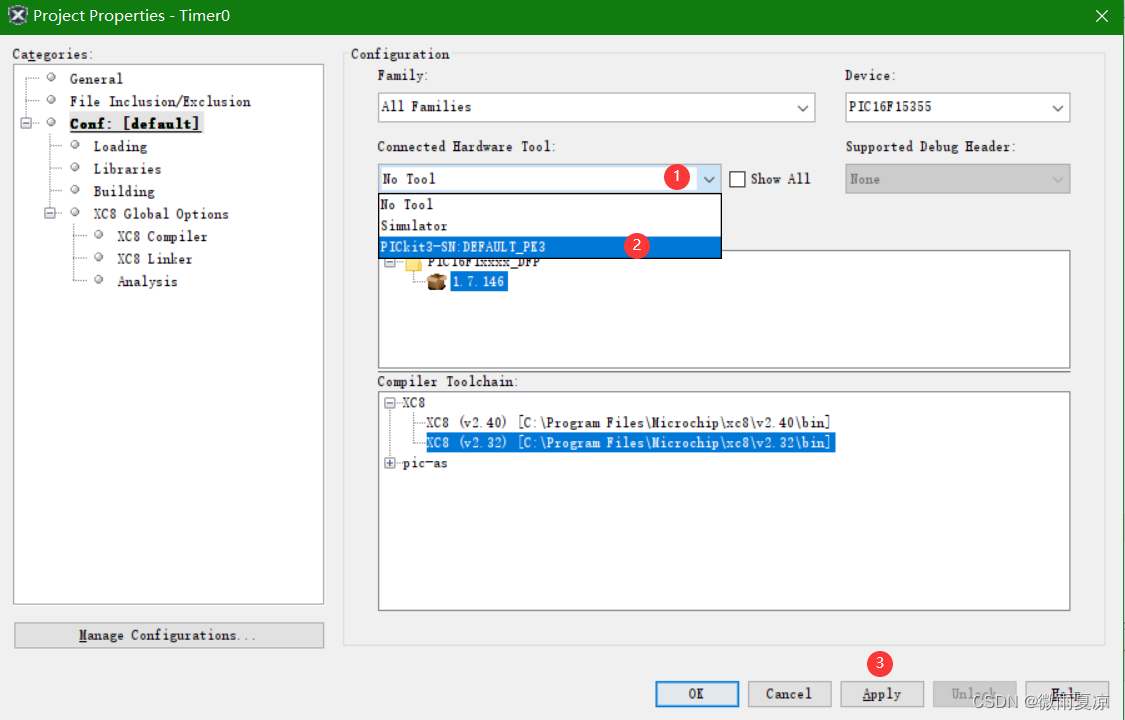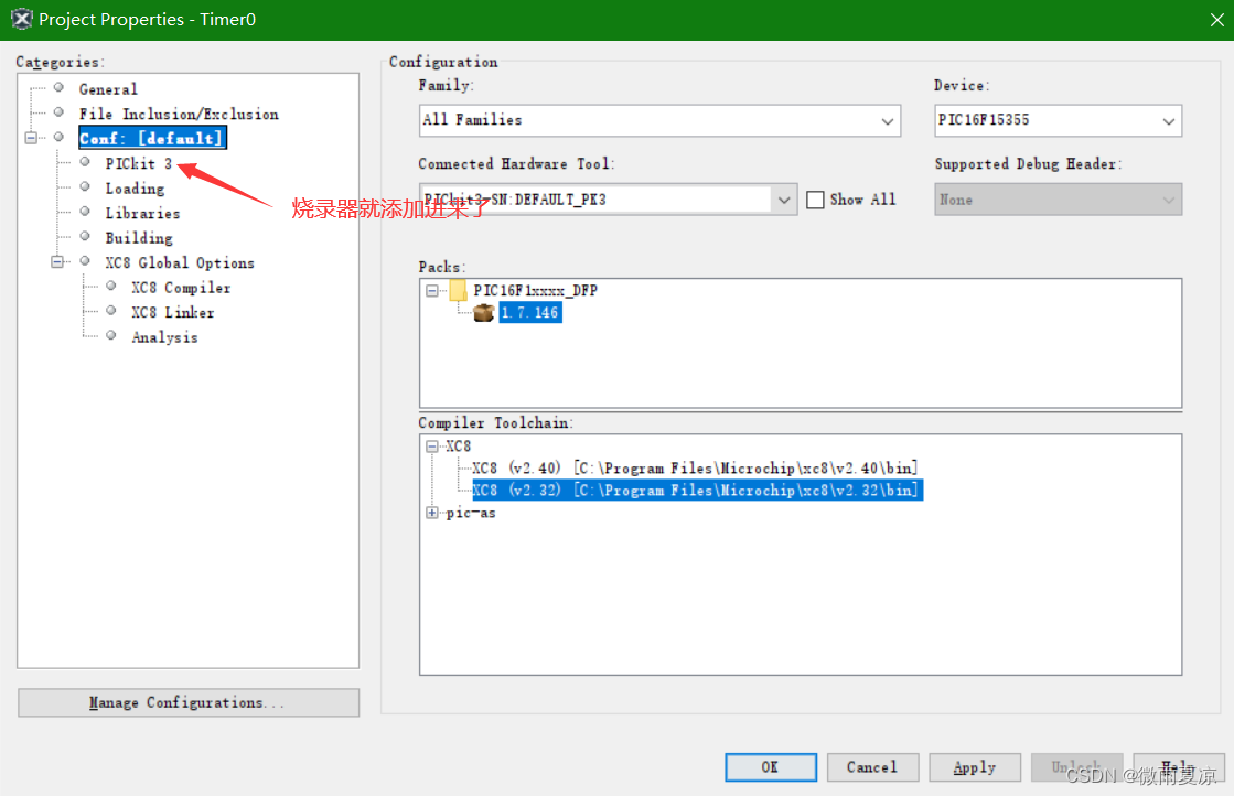 因为我们用是的是PICkit3,所以这里就选中PICkit3,点击apply