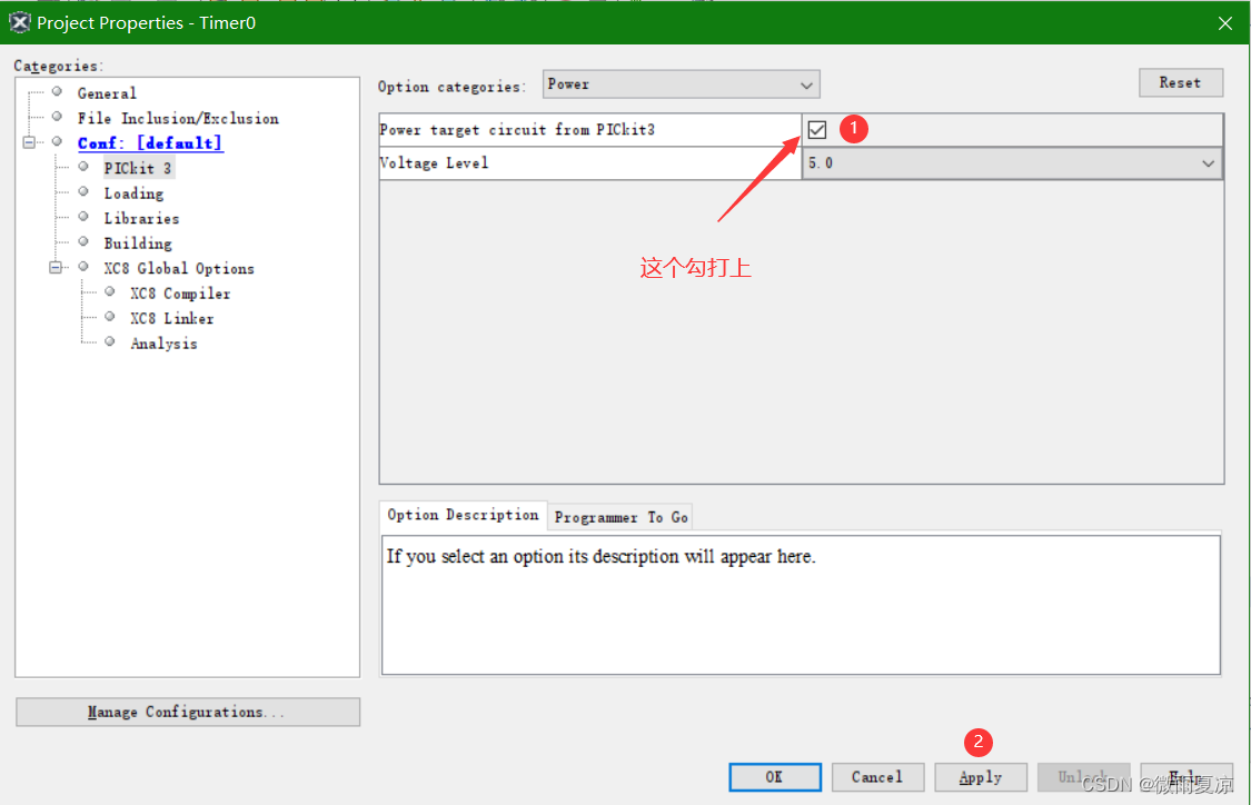 如果烧录时,要用PICkit3供电烧录(我们常说的内部供电),操作如下,如果是外接电源烧录,到这里,就可以点击Ok,退出当前界面,回到烧录界面,就可以正常烧录了。