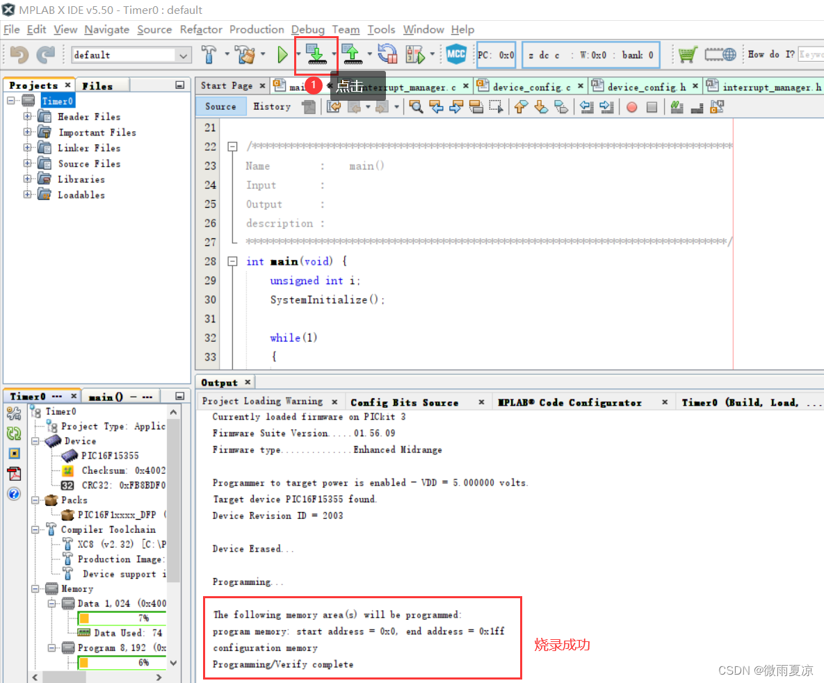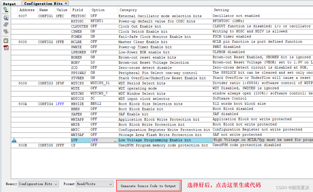 到这里,是不是可以进行烧录了呢?不急,还有很重要的一个步骤,MCU配置位的设置,要先把MCU的配置位弄好,要不然就是烧录了,MCU也不能工常工作,那配置位如何操作呢?