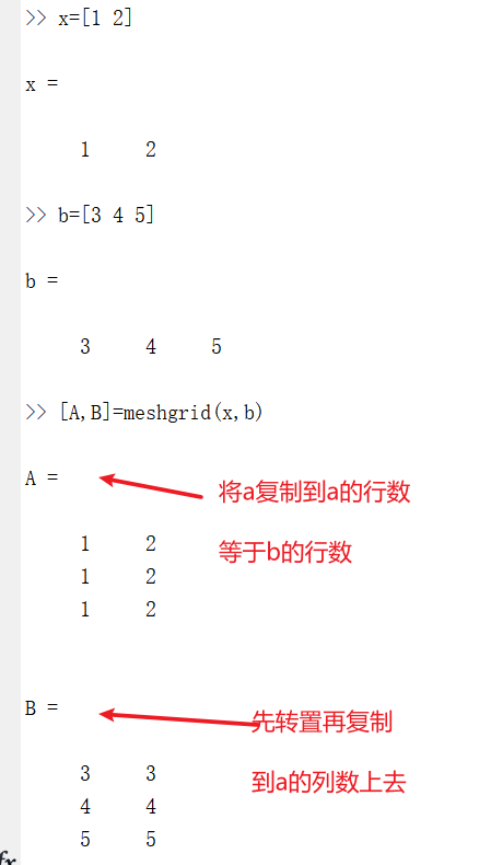 生成size(b)Xsize(a)大小的矩阵A和B。它相当于a从一行重复增加到size(b)行,把b转置成一列再重复增加到size(a)列。因此命令等效于: