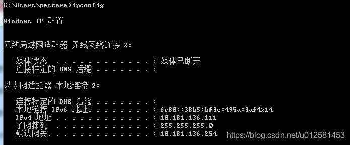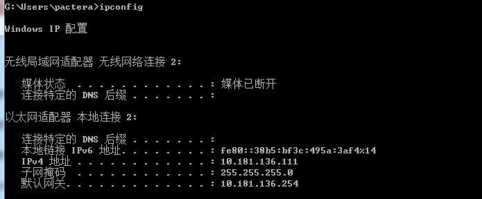 通过ipconfig查看当前内网的网络配置,获取到ip、子网掩码、默认网关等信息。