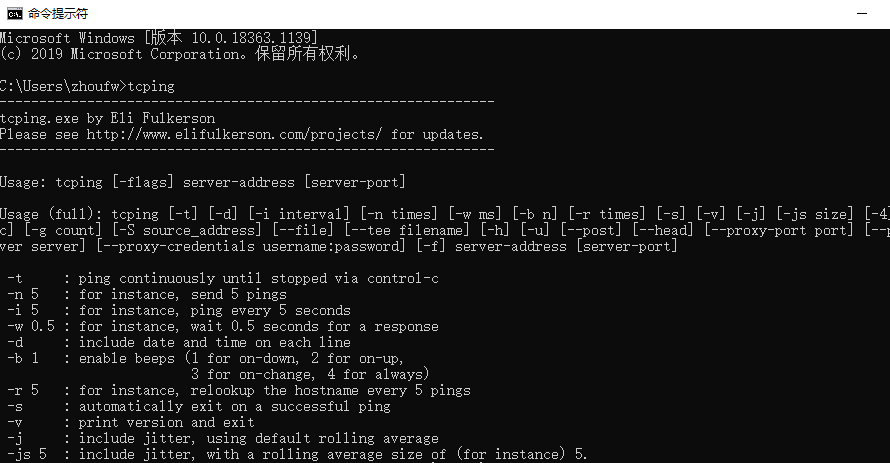 cmd打开命令提示符,输入tcping 如果出现帮助文档说明安装命令成功