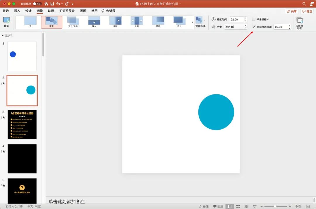 但是,当你点击放映的时候,会发现圆并没有变化,原因就在于没有修改默认的幻灯片切换选项。这里要把勾从「单击鼠标时」切换到「自动换片间隔」。「单机鼠标」表示在放映的时候,你点击鼠标才会切换到下一页,这个适用于在做 ppt 汇报的时候来用。