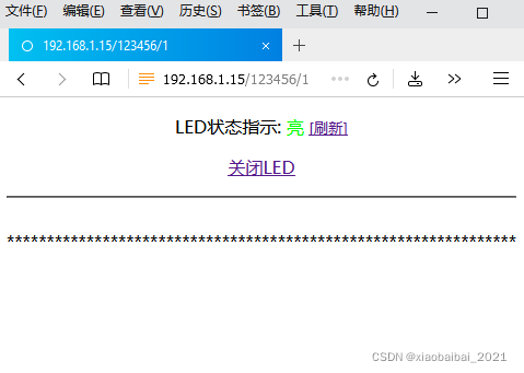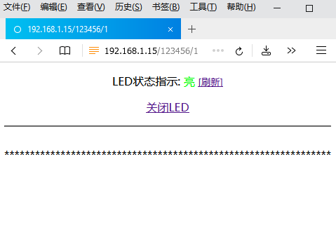 在计算机上用浏览器打开网址:192.168.1.15/123456,可以打开一个网页,如下图所示,点击打开LED/关闭LED,网址后会多出现一个 /0或/1,通过这个网址的变化可以控制开发板上的灯亮灭。该网页是应用层通过tcp按http协议格式发送的数据,所以tcp通信也是成功的。