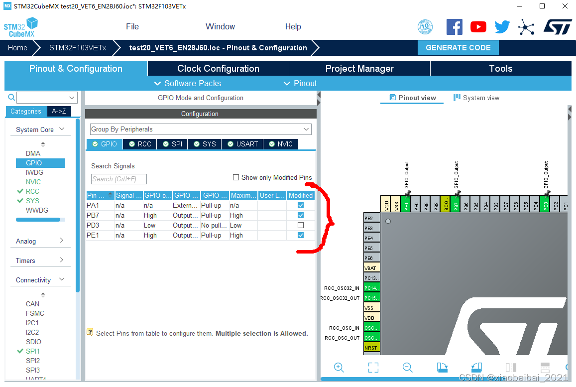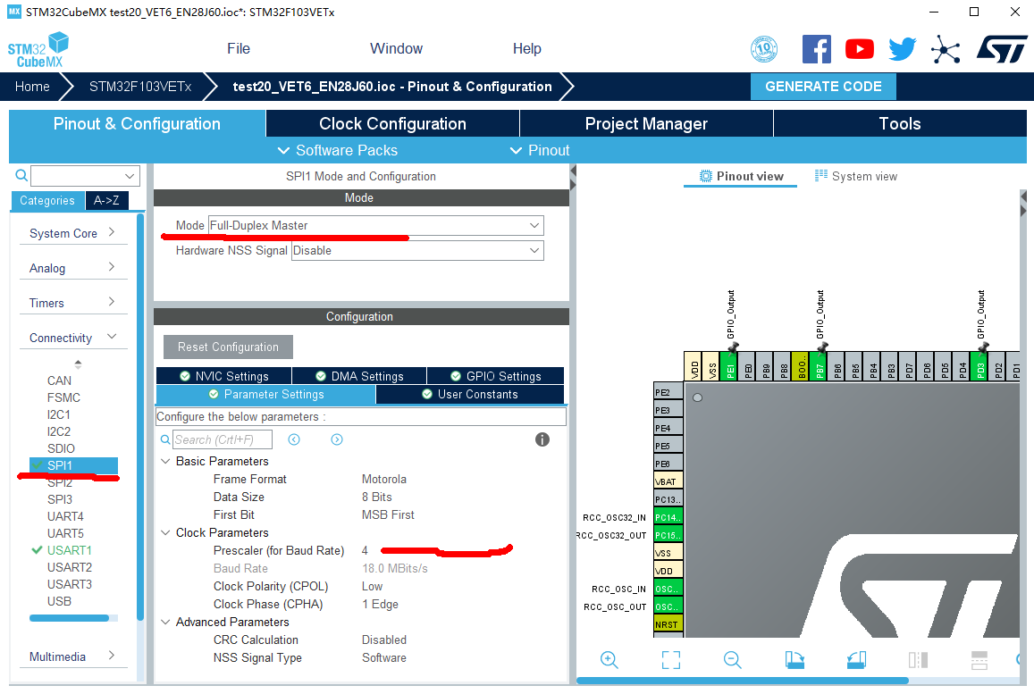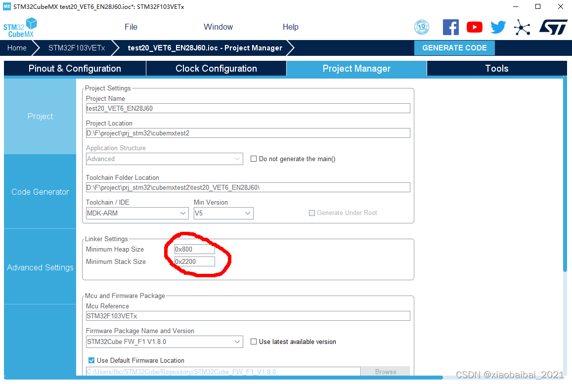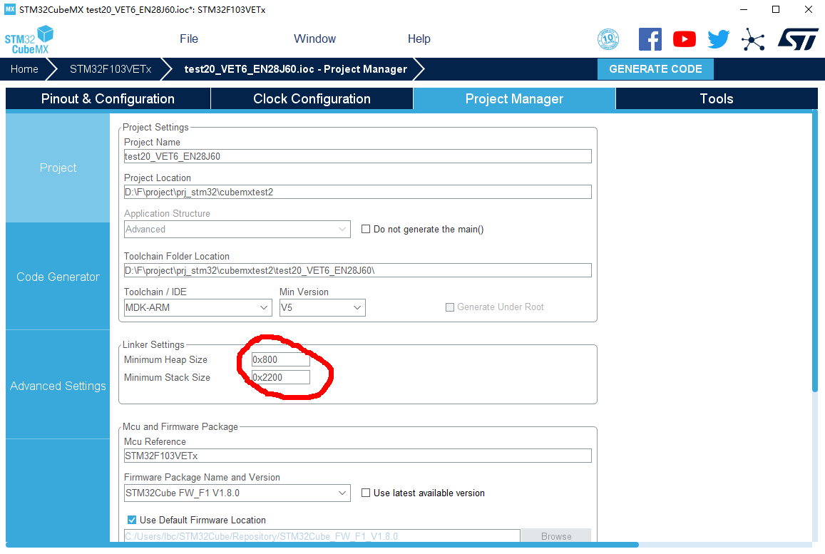 本节的例子使用的开发环境是cubemx 6.1.0,pack版本是1.8.0;硬件使用的是stm32f103VET6和ENC28J60。