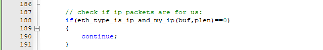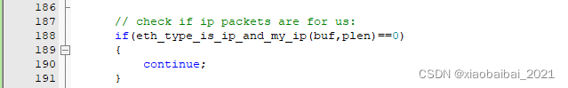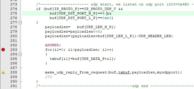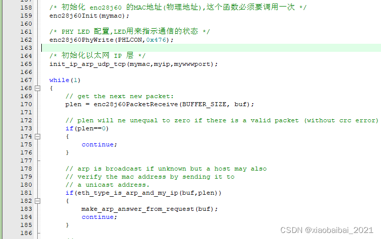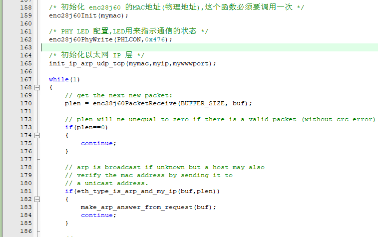先设置MAC地址、IP地址,然后进入while(1)循环,在循环中判断enc28j60是否收到数据,如果收到,则通过下面的几个if去判断收到的是什么类型的数据,再对应处理。