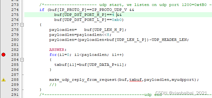 接收的数据被存放在 buf 数组中,软件通过判断 buf 数组里的IP_PROTO_P这个字段来确定是否是UDP数据包,如果是,则再判断是否是1200端口收到的;
