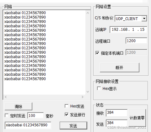 使用网络调试助手,设置udp连接,远端ip为192.168.1.15,远程端口为1200,本地端口也设置为1200。