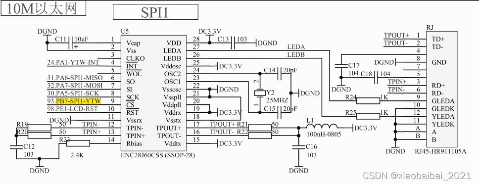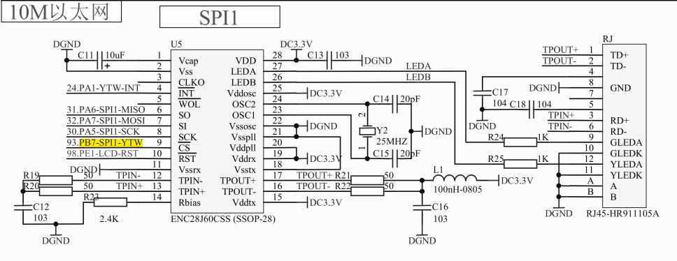 ENC28J60这款芯片可实现10M的以太网通信,与MCU是使用SPI接口,接在SPI1口上,使用软件控制CS线,另外还连接了RST复位引脚、INT中断引脚。