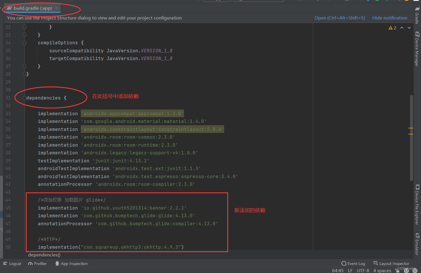 (5)添加依赖,以添加glide依赖为例,作用是加载图片