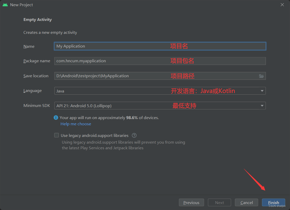 (3)设置项目名、包名、存储路径、以及开发语言等,点击 “Finish”