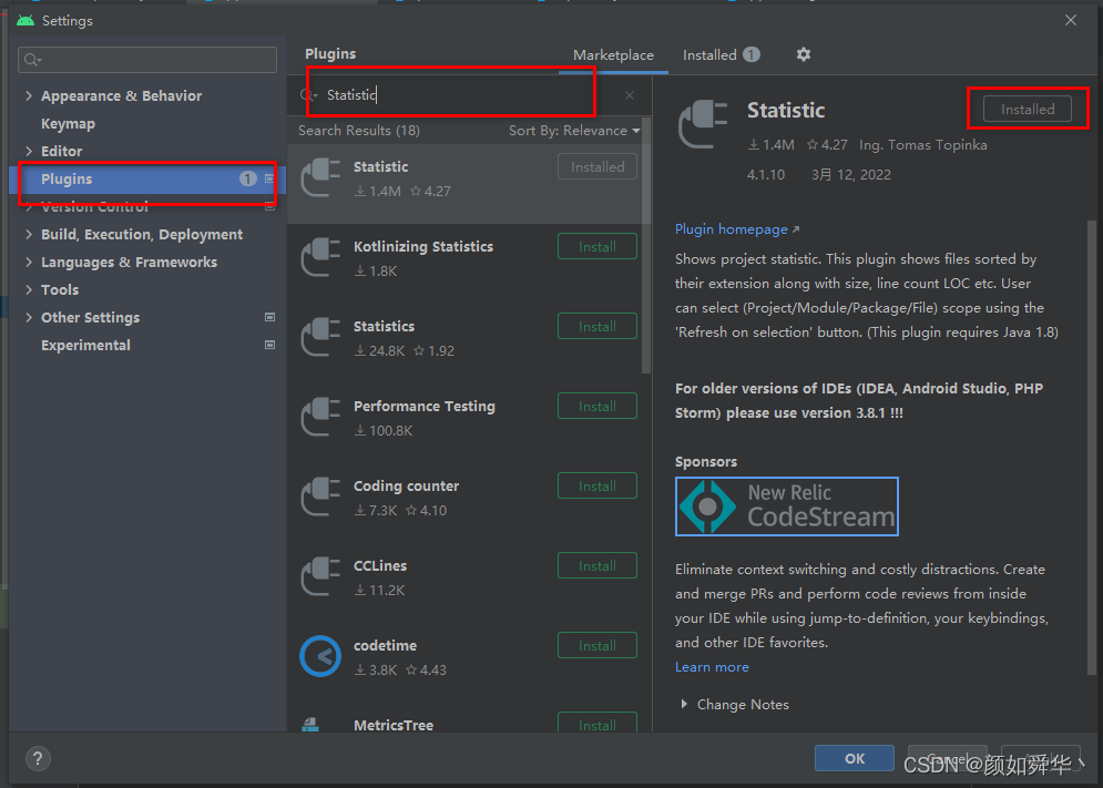 点击File → Setting→ Plugins,搜索Statistic插件,点击install按钮安装插件。