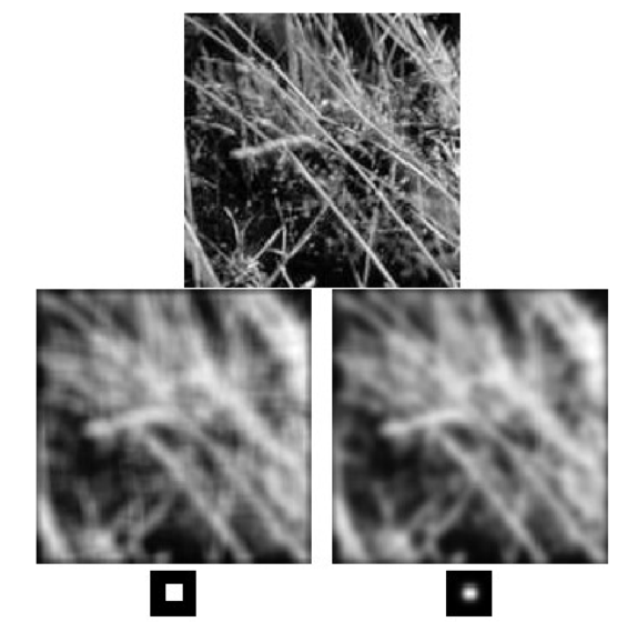 滤波核是一个正方形,新图中每个像素点值用原图中一块矩形区域相似累加平均得到,这么做会引发一点点问题,导致新图上产生横竖一样的痕迹纹路。如果把滤波核换成各方向中心对称的高斯核,则没有这个问题。两者效果对比如下(右下角图采用的高斯核进行平滑滤波):