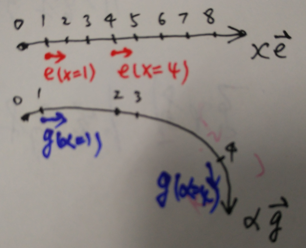 再看下面的黑线(黎曼线空间里的线),每个号码之间的间隔不同,而且,基标矢量g的方向也在一直变(看蓝色),也就是说,这个线空间是弯曲的!而且,这个基标矢量的大小不一定是1哟。