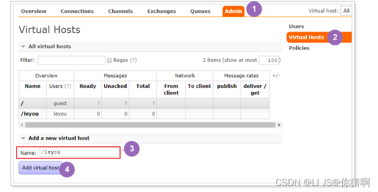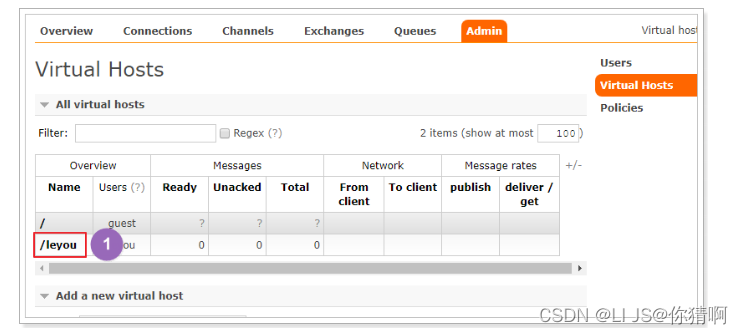 为了让各个用户可以互不干扰的工作,RabbitMQ添加了虚拟主机(Virtual Hosts)的概念。其实就是一个独立的访问路径,不同用户使用不同路径,各自有自己的队列、交换机,互相不会影响。