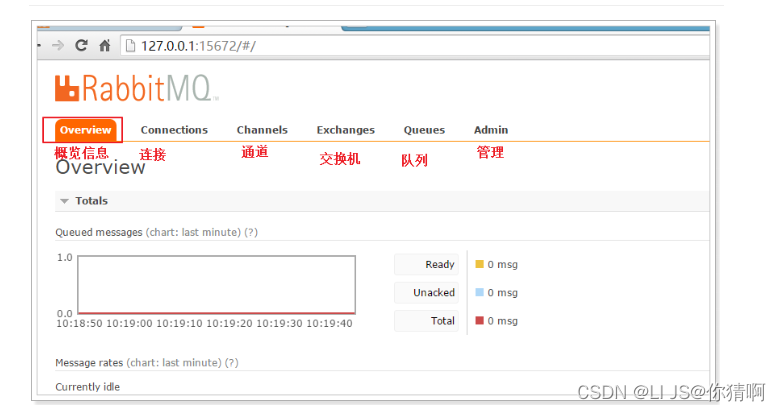 connections:无论生产者还是消费者,都需要与RabbitMQ建立连接后才可以完成消息的生产和消费,在这里可以查看连接情况