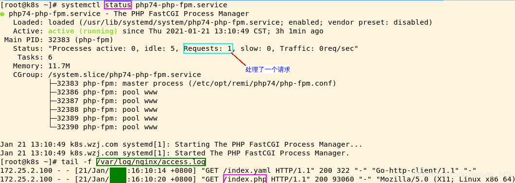 1) nginx'本身不能'处理PHP,它只是个'web服务器-->只能处理静态请求',当接收到请求后,如果是php请求,则'发给php解释器处理',并把结果返回给'web服务器',最后'再给'客户端备注: nginx'默认并不支持'php等动态语言,nginx是服务器'主要用来'处理HTTP请求,其本身'并不支持'解析运行PHP代码的能力,需要'配置php-fpm'来运行php代码2) nginx一般是把'请求发fastcgi管理进程'处理,fascgi管理进程'选择cgi子进程'处理结果并'返回'被nginx