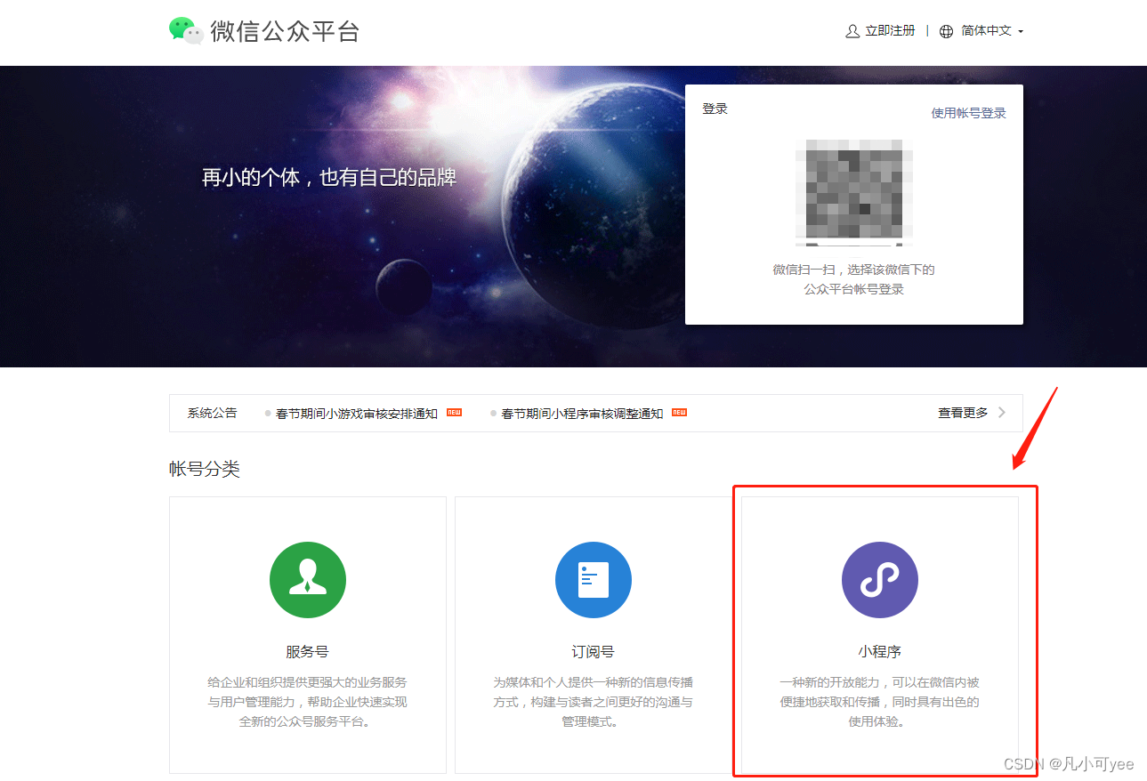 先准备好小程序账号,注册小程序账号比较简单,就不细说了,在微信公众平台网站上注册就可以;还可以是在公众号后台的“小程序管理”里快速注册。不过在注册账号的时候需要注意小程序主体类型,一般是企业或者个体工商户比较适合。