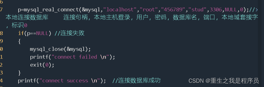 连接数据库:mysql_real_connect(连 接 句 柄 , 本 地 主 机 登 录 , 用 户 , 密 码 , 数 据 库 名 , 端 口 , 本 地 域 套 接 字, 标 识 0);
