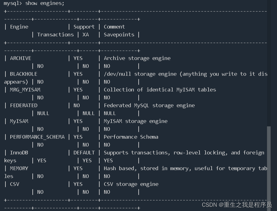 查看数据库存储引擎:show engines;