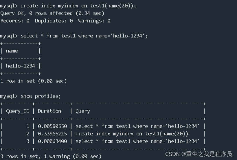 查看执行事件的时间:show profiles;