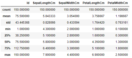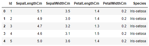 <class 'pandas.core.frame.DataFrame'> RangeIndex: 150 entries, 0 to 149 Data columns (total 6 columns): Id 150 non-null int64 SepalLengthCm 150 non-null float64 SepalWidthCm 150 non-null float64 PetalLengthCm 150 non-null float64 PetalWidthCm 150 non-null float64 Species 150 non-null object dtypes: float64(4), int64(1), object(1) memory usage: 7.1+ KB