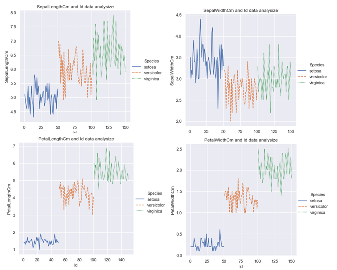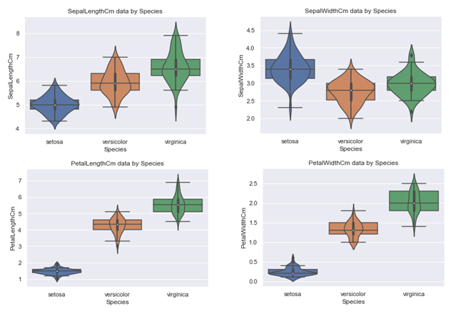 除了setosa种类外, 中位数在其他种类的四个属性中均表现为: SepalLengthCm > PetalLengthCm > SepalWidthCm > PetalWidthCm